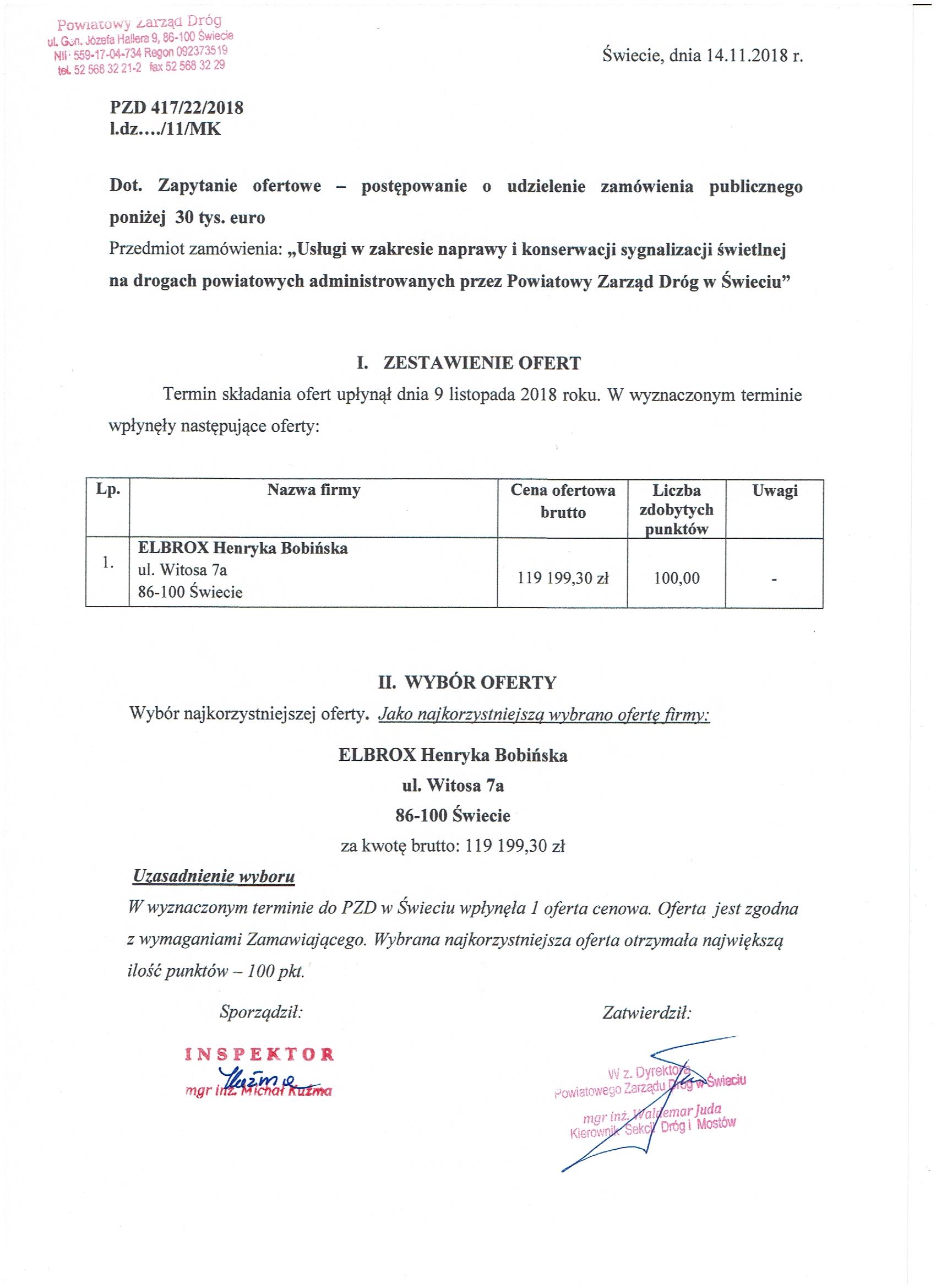 „Usługi w zakresie naprawy i konserwacji sygnalizacji świetlnej na drogach powiatowych administrowanych przez Powiatowy Zarząd Dróg w Świeciu.”